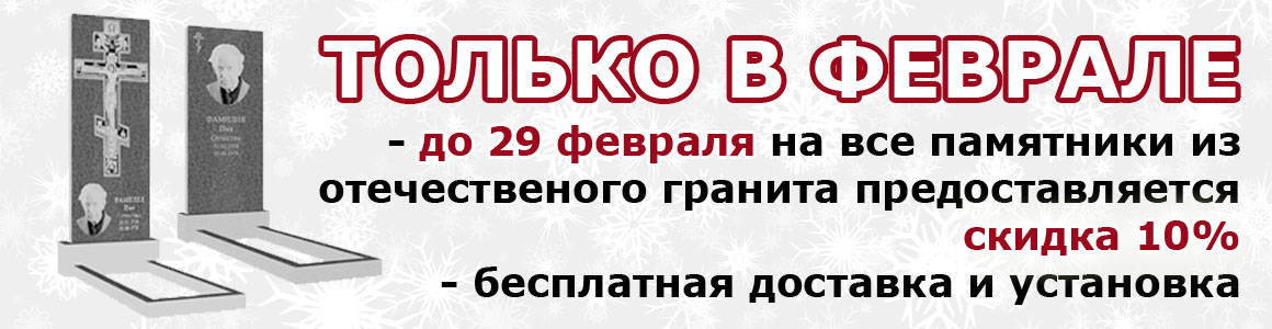 Только в феврале компания "Уралкомплект" проводит акцию: скидка 10% на все памятники из отечественного, доставка и бесплатная установка до 29 февраля 2016 года!